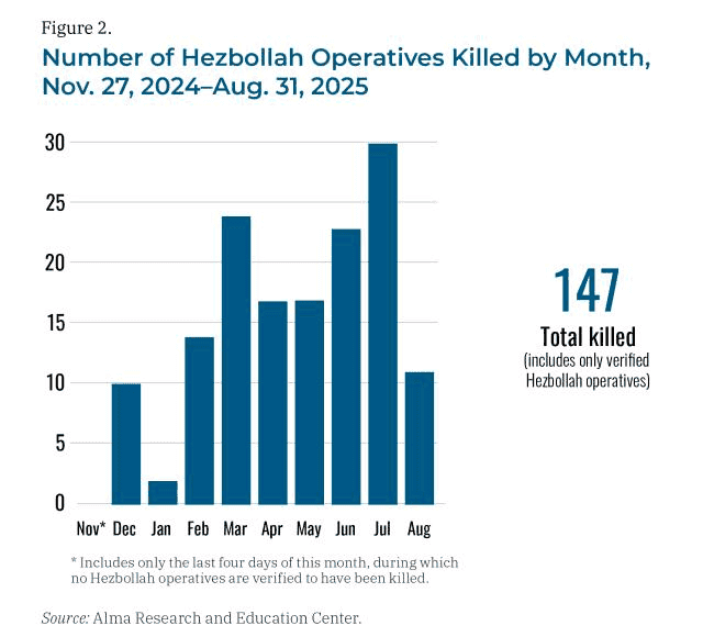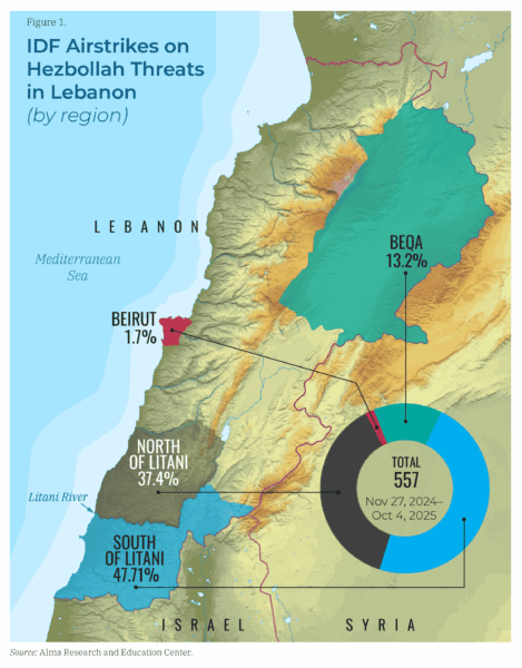 Despite this necessity, Lebanon’s political and military leaders have signaled their reluctance to use the full power of the state and army to implement Hezbollah’s disarmament, which should extend as well to twelve Palestinian refugee camps within its territory. This hesitancy will likely be especially apparent after January 1, 2026, when according to the Lebanese government’s disarmament plan, the focus should turn to Hezbollah’s weapons facilities north of the Litany River. If, at that time, disarmament remains stalled, the prospect of Israel launching an operation to complete the mission itself will become substantially more likely, as U.S. envoy Tom Barrack recently warned (see figures 1 and 2 for Israel’s anti-Hezbollah attacks since November 2024). Hamas has also refused to disarm in Lebanon’s refugee camps, posing a separate difficulty.