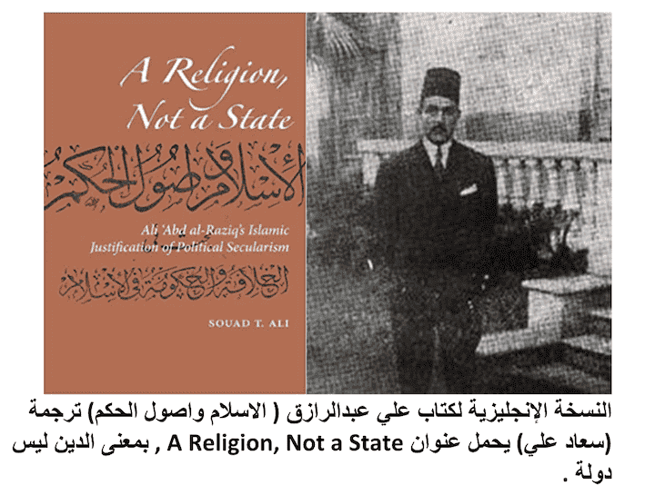 أخص بالذكر هنا علي عبد الرازق المفكر والأديب، وشيخ الأزهر ووزير الأوقاف في مصر في 1948م. أصدر عام 1925 كتاب («الإسلام وأصول الحكم») وأثبت بالشرع وصحيح الدين عدم وجود دليل على شكل معيّن للدولة في الإسلام، بل ترك الله الحرية في كتابه للمسلمين في إقامة هيكل الدولة، ويُعدُّ أولَ دراسة شرعية تؤسِّس للفكرة العَلمانية داخل الوسط الإسلامي. شذوذ هذا الرأي وإنكاره لـــ(الخلافة الإسلامية) أحدثا ردة فعلٍ صارمة شديدة ضده. أهم القوى التي شنت حملة على رأيه: حزب الإتحاد ، و هيئة كبار العلماء، سعد زغلول وحزب الوفد ، وحزب الأحرار الدستوريين، و حتى الليبراليين!