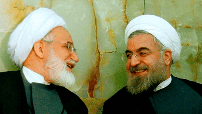 ( الصورة: مهدي كروبي رئيس برلمان أسبق، وحسن روحاني رئيس إيران لمدة 8 سنوات. أثناء حرب الـ12 يوماً وردت معلومات بأن روحاني سعى إلى تأليب حوزة قم ضد خامنئي)