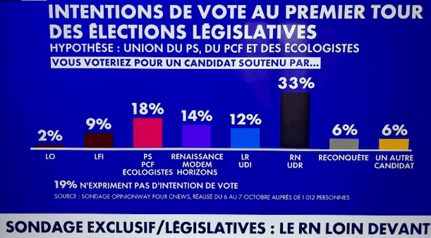 والسبب هو أن إئتلافاً يضم “الحزب الاشتراكي”، وحزب “الساحة العامة” بزعامة رافاييل غلوكسمان، وحزب الخضر، والحزب الشيوعي، يُقدّر حصوله على 19% من نوايا التصويت، ما يضعه في المرتبة الثانية، بينما يهبط يهبط حزب “فرنسا الأبيةّ إلى 8% فقط.