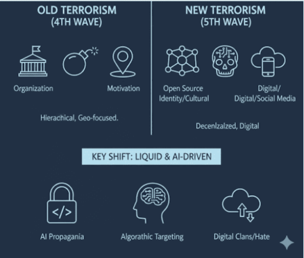 تنبثق الموجة الخامسة من رحم “العولمة المنكسرة“. فمع تآكل السيادة الوطنية، ارتد الإنسان نحو “العشائر الرقمية“؛ وهي ولاءات هجينة تزاوج بين العرق والعقيدة بحثاً عن “نقاء استئصالي“. هذا الإرهاب “عبرسياسي” بطبعه، فهو لا يهدف لتغيير نظام حكم، بل يسعى لهدم الواقع المادي وتشييد “يوتوبيا” نقية متخيلة. إنالمقاتل الجديد لا يفاوض، بل يسعى لمحو الآخر الوجودي، مما يفسر الوحشية المفرطة التي تتجاوز أي غاية سياسية عقلانية.