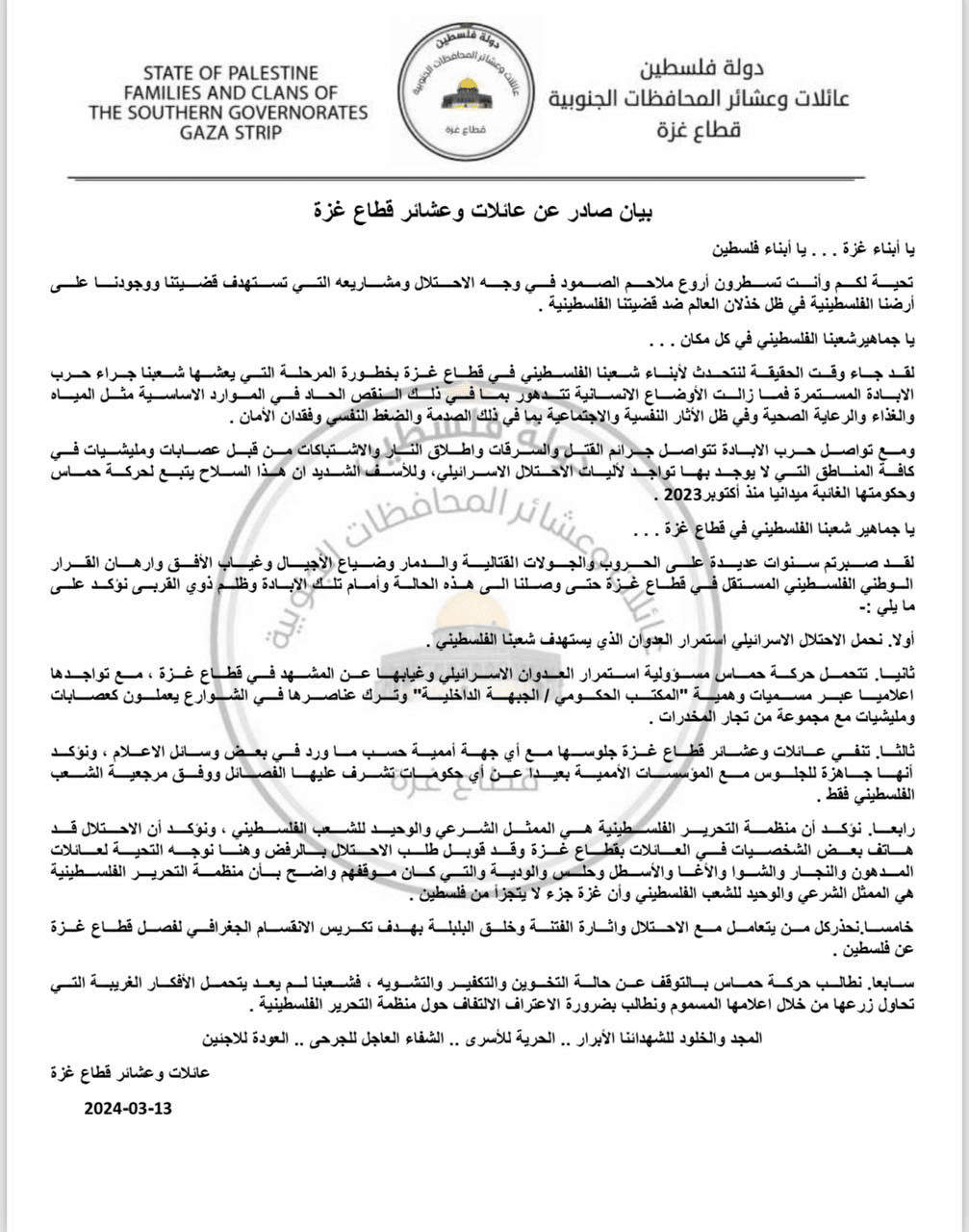 أنت الآن تتصفح:الرئيسية»شفّاف اليوم»بيان عشائر غزة: “السلطة” بدأت “المرحلة الإنتقالية” لاستعادة غزة من “حماس”!»bayangaza
