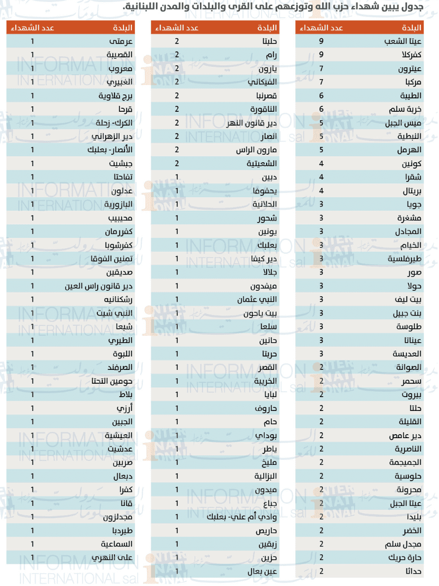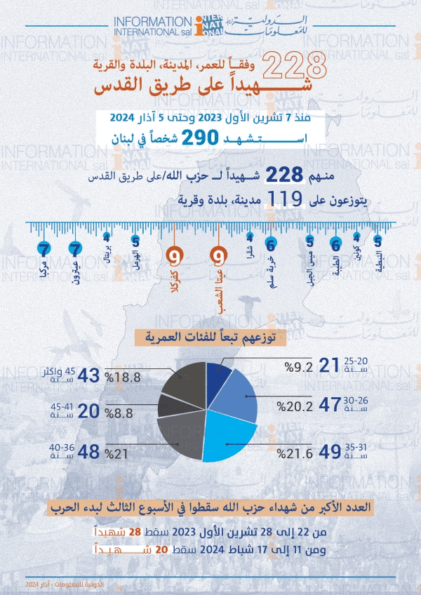 في اليوم التالي لاندلاع الحرب في غزة (أسمتها حماس والجهاد الإسلامي “طوفان الأقصى”) فجر يوم السبت في 7 تشرين الأول 2023. اندلعت الحرب في جنوب لبنان بين حزب الله وجيش العدو الإسرائيلي وقد أدت هذه الحرب حتى اليوم الثلاثاء في 5 أذار 2024 إلى استشهاد 290 شخصاً بينهم 228 شهيداً لحزب الله سقطوا على طريق القدس كما “زفهم” حزب الله. ويتوزع هؤلاء الشهداء على 119 قرية وبلدة ومدينة كما في الجدول التالي، حيث أن العدد الأكبر من الشهداء كان في كل من بلدة عيتا الشعب وكفركلا وبلغ 9 شهداء في كل منها ومن ثم مركبا وعيترون 7 في كل منها، و6 في كل من خربة سلم والطيبة.