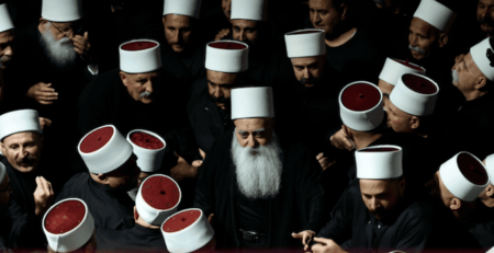 (الصورة: الزعيم الروحي للدروز في إسرائيل، الشيخ موفق طريف (وسط)، يقود استقبال وفد ديني درزي من سوريا في مقام النبي…