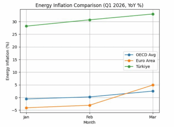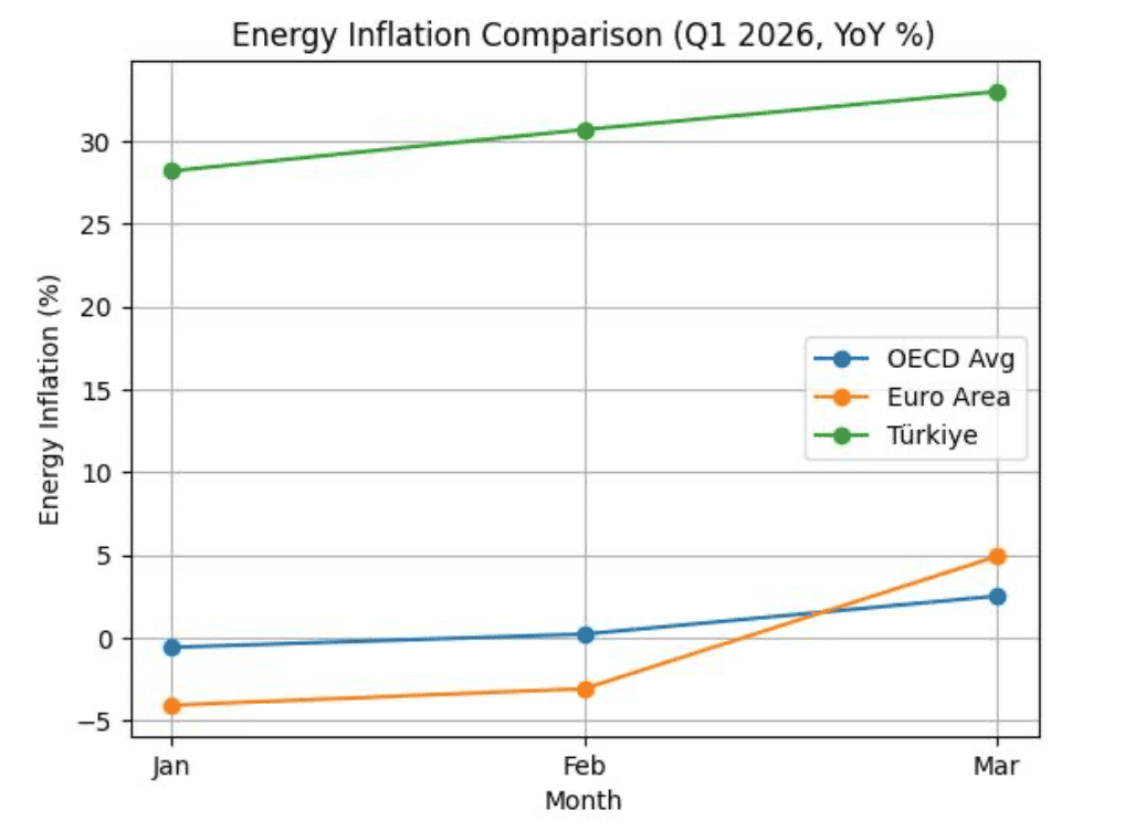 More tellingly, Türkiye’s energy inflation is not only higher than the OECD average. It is multiple times higher than the second-highest country in the group. In a context where many economies are still managing single-digit energy inflation, Türkiye’s trajectory stands apart.